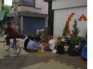 ダンボールの中で寝る人、座って飲み会を開く人々などがいました。