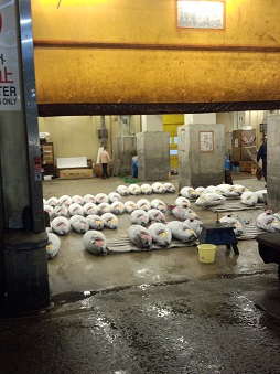 セリ場内。この写真は左手側です。手前にあるのがミナミマグロ、