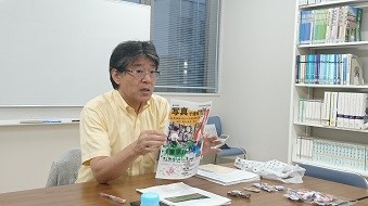 上記写真 写真に注視しながら、皆で議論をしているところ(左:3年園木君、右:3年佐藤君)