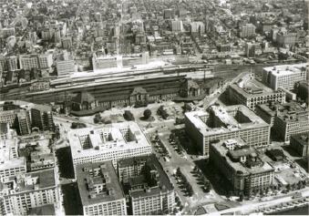 1954年ごろの空撮。復旧した丸の内駅舎の前に丸ビル、新丸ビルが見える。プラットホームは戦時中に1面、戦後に2面が増設され7面となっている。八重洲ビル側にも多くのビルが建っている。空襲そのものは丸の内側より八重洲側に被害を与えた。空襲の際、既に占領後は丸の内に進駐することを目論んでいたといわれる