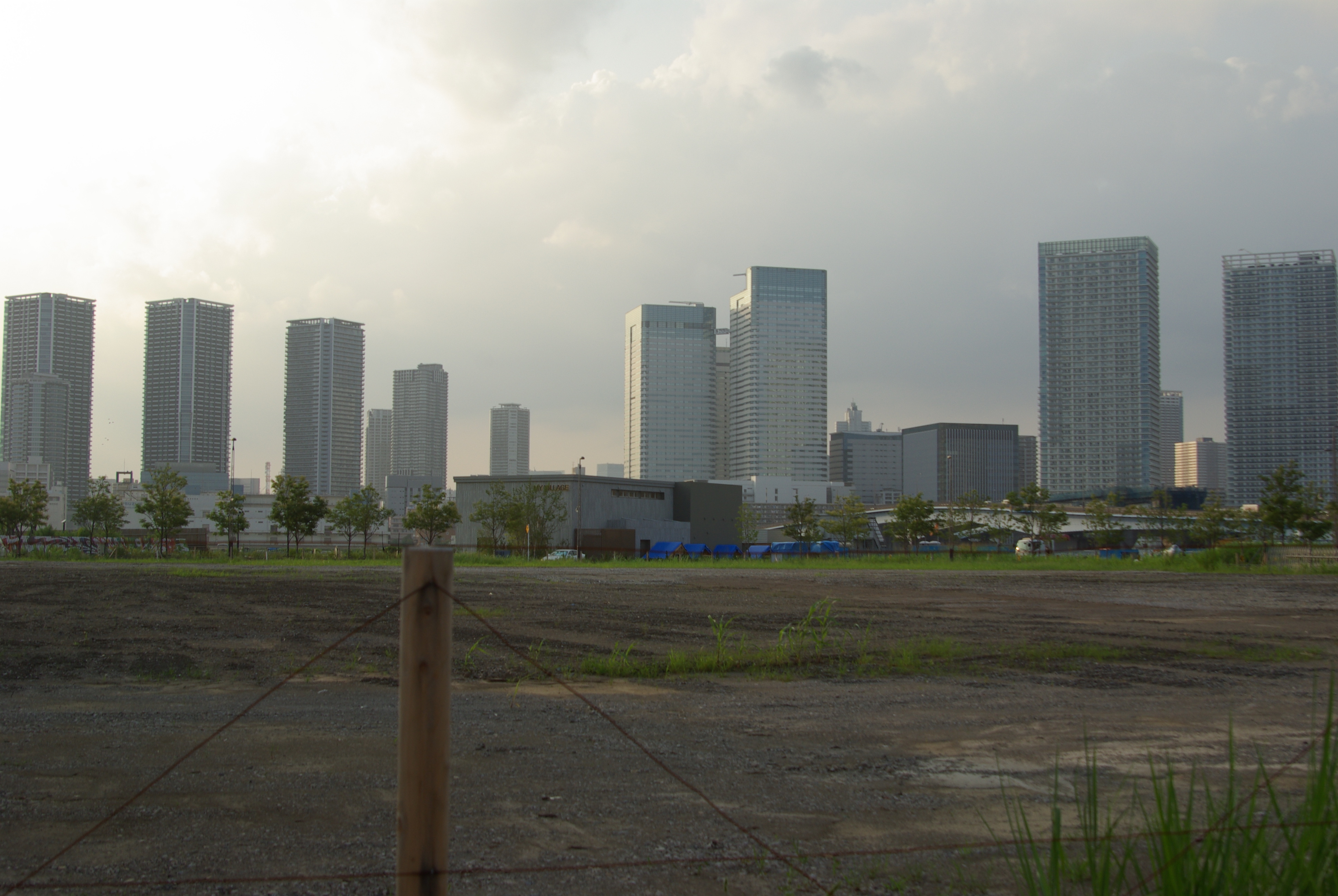 東京臨海新交通臨海線(ゆりかもめ)市場前駅構内から北方向を臨む風景。奥の高層ビル群は開発が急ピッチで進む晴海にあり、中央がトリトンスクエア、両側には真新しいタワーマンションが並ぶ。手前の空き地だが、2016年9月現在、市場建設作業員の仮設小屋が建ち、写真撮影者の背後にある新市場の主要施設はほぼ完成していた。ここが築地の東京都中央卸売市場の移転先に決まったのは2001年、市場前駅の開業は2006年のことだった。
